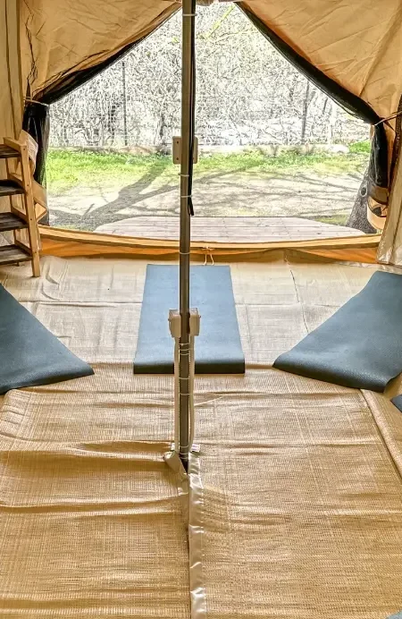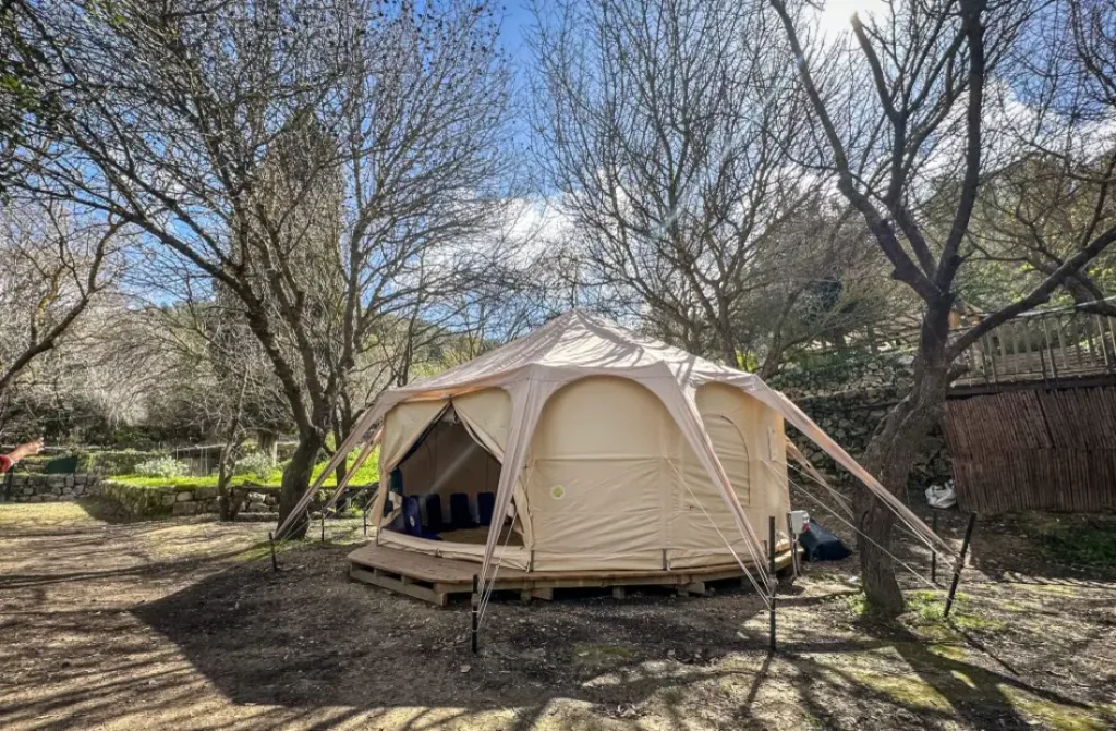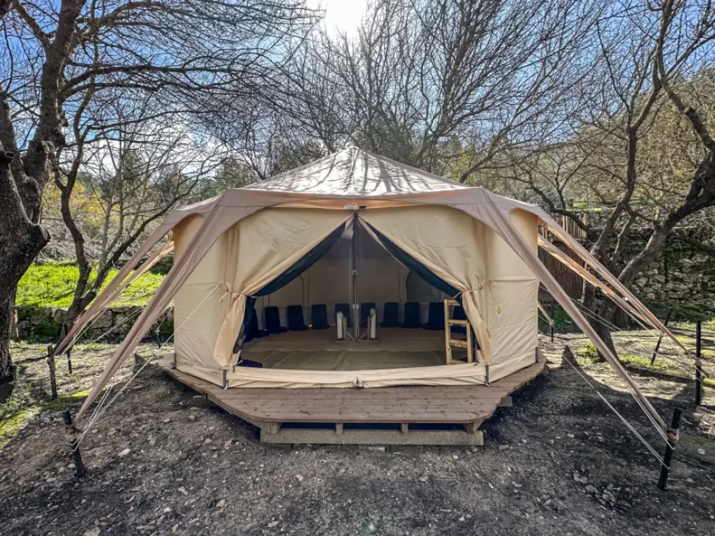 אוהל קנבס בדגם "יורט", בנוי על דק עצי אורן, מוגן מגשם ורוחות, מבודד ביריעה טרמית ייחודית, מחומם ומואר.
