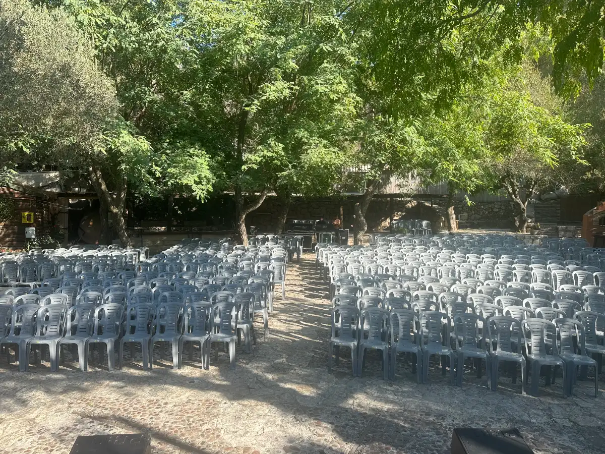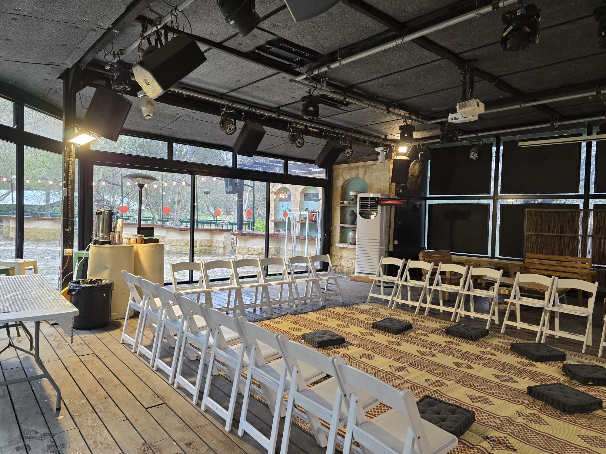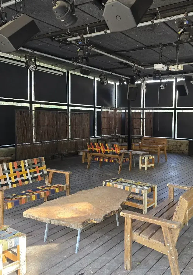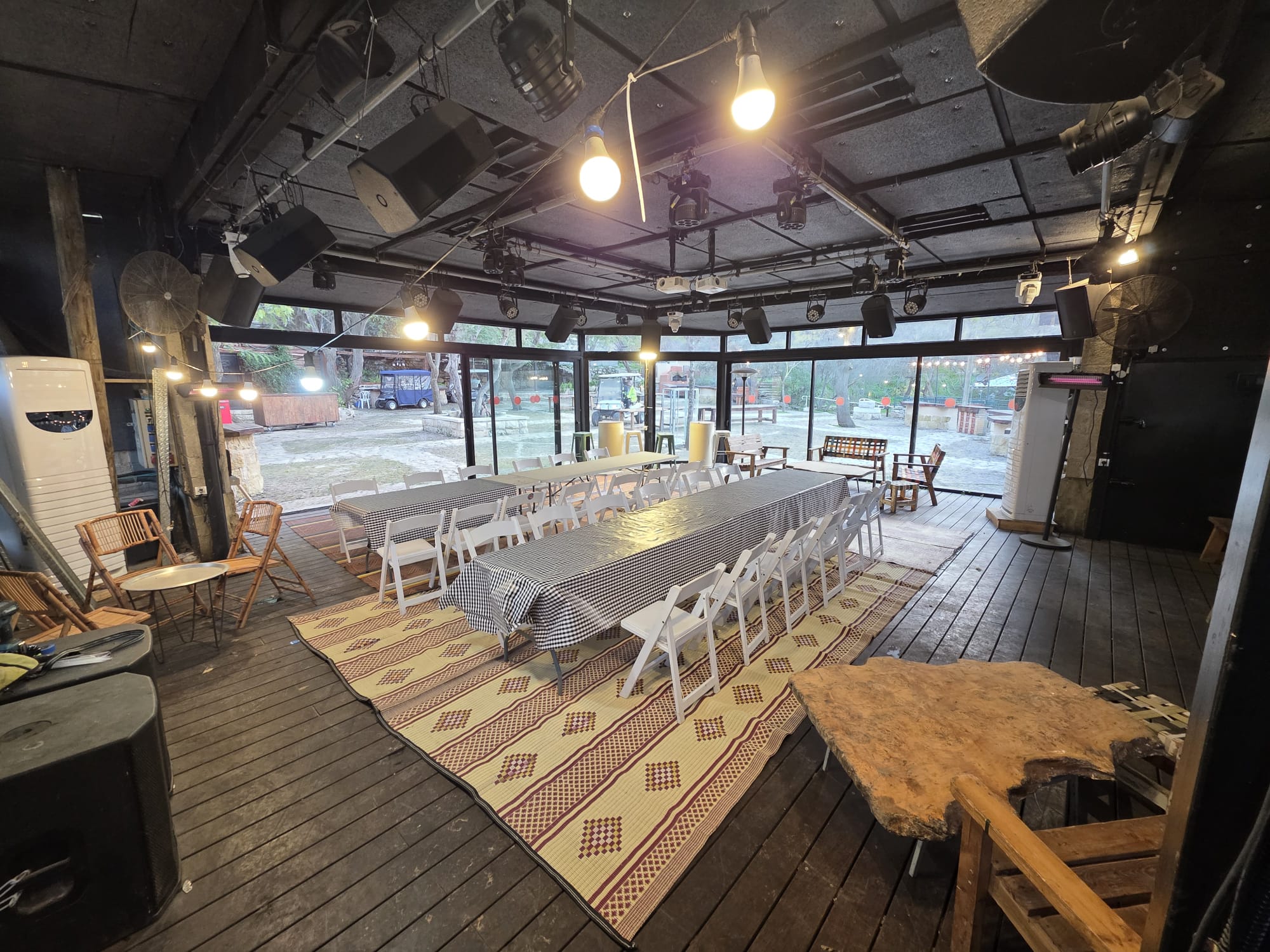 ברחבה מותקנים ציוד הגברה ותאורה, ציוד חימום וישיבה, וציוד להסעדה עד 40 משתתפים ותוכלו להזמין בנפרד את השימוש בציוד המובנה.