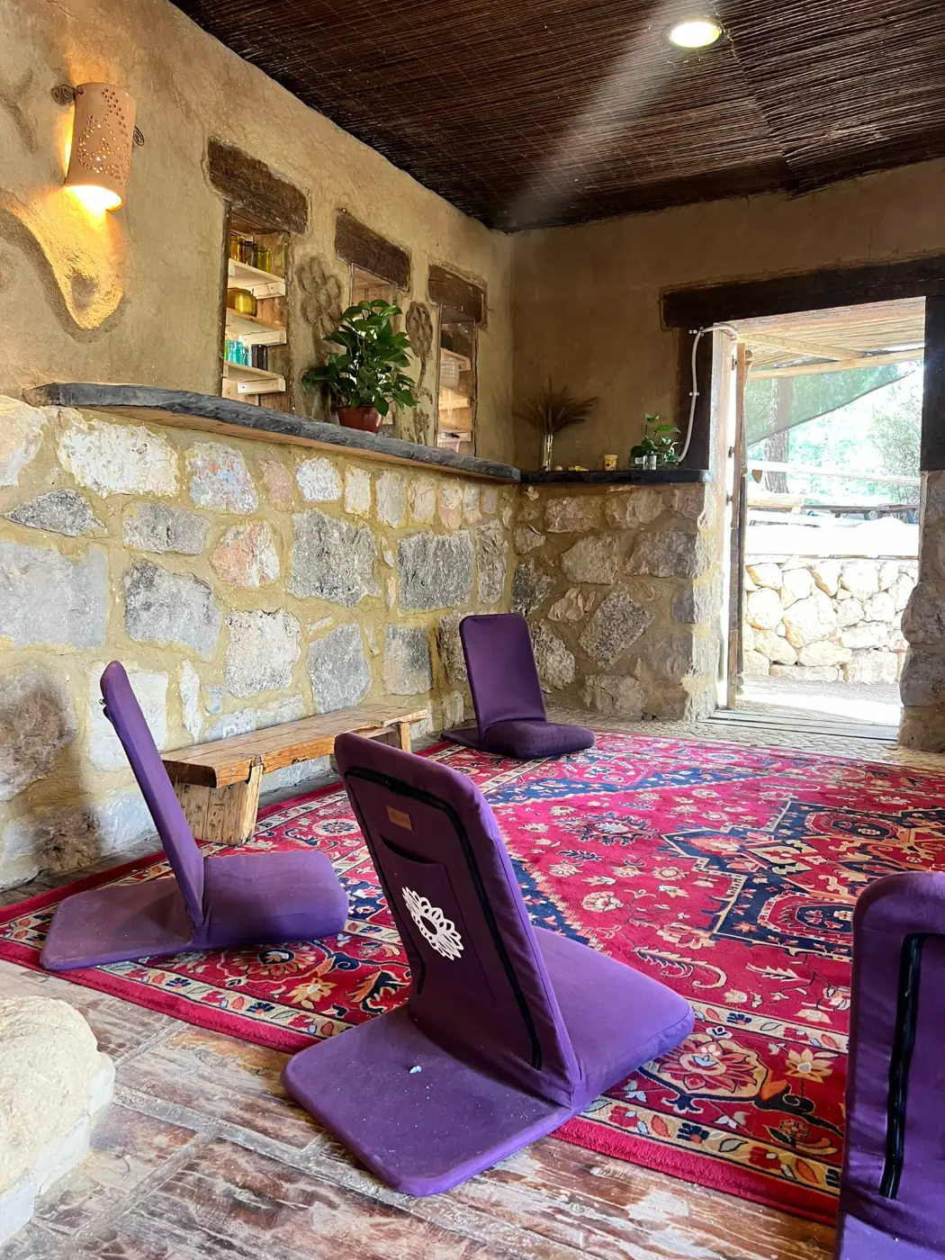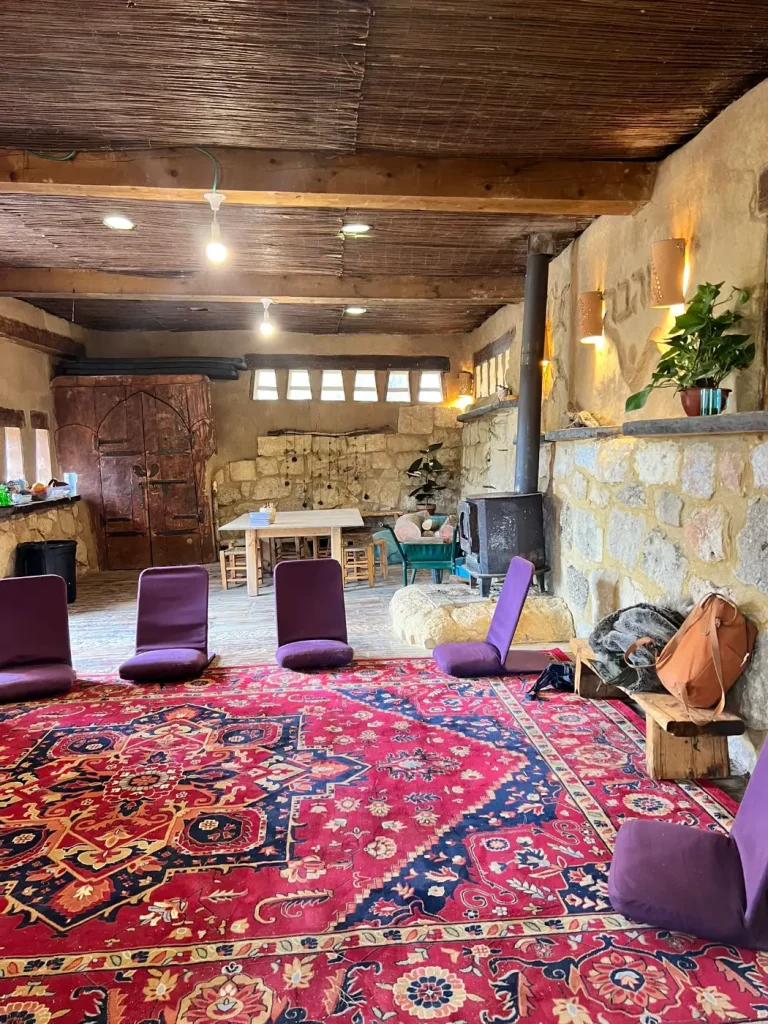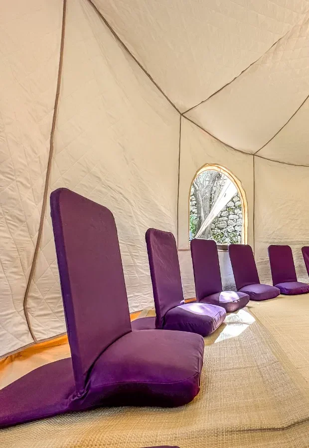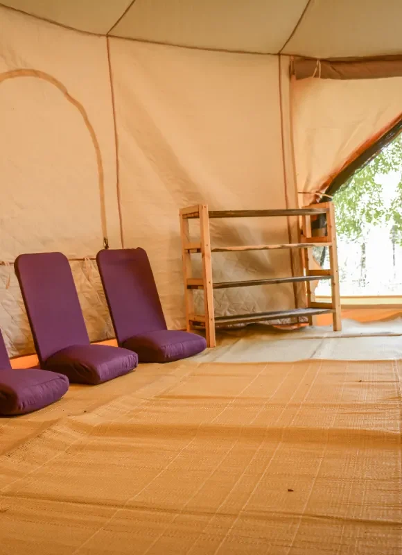 בתוך האוהל – מחצלות, מזרנים, כסאות מדיטציה, וכריות ישיבה.