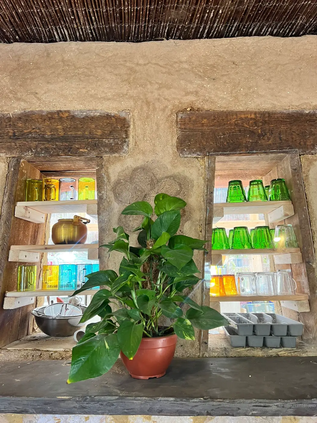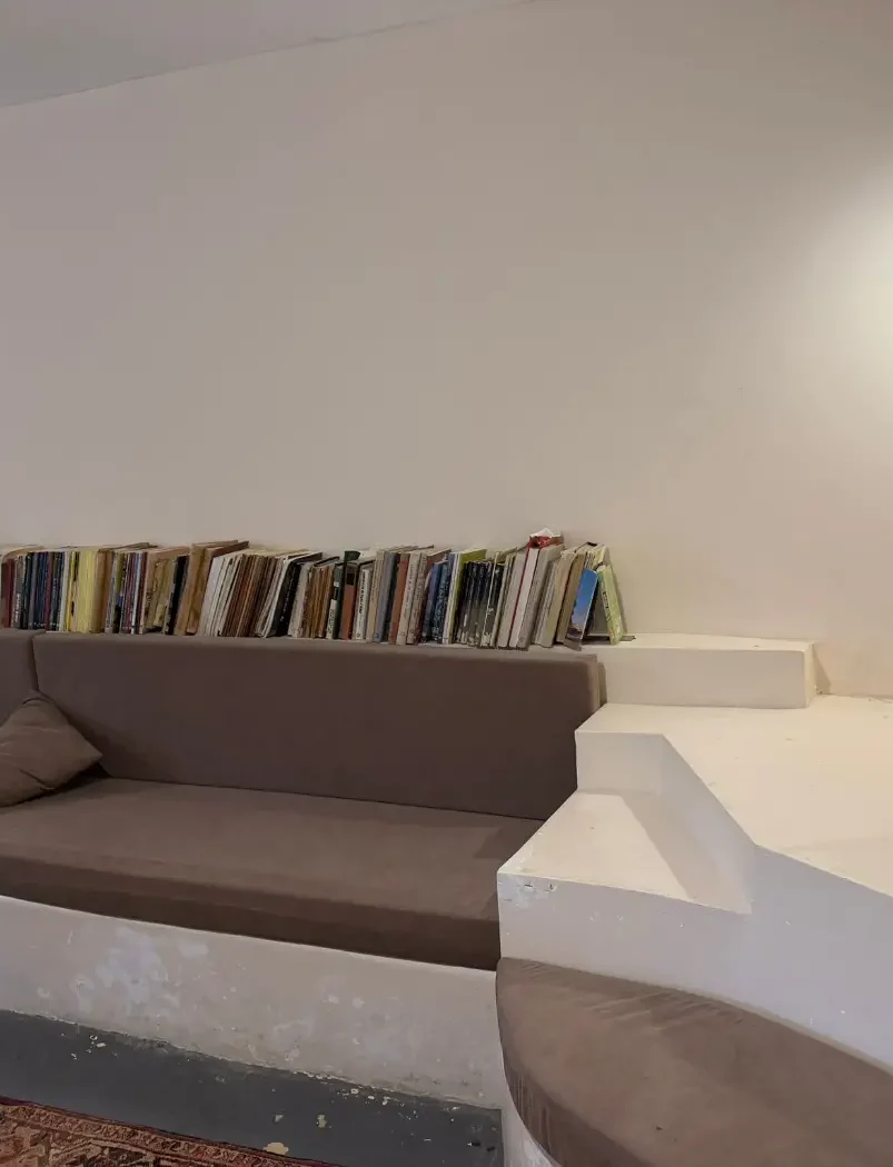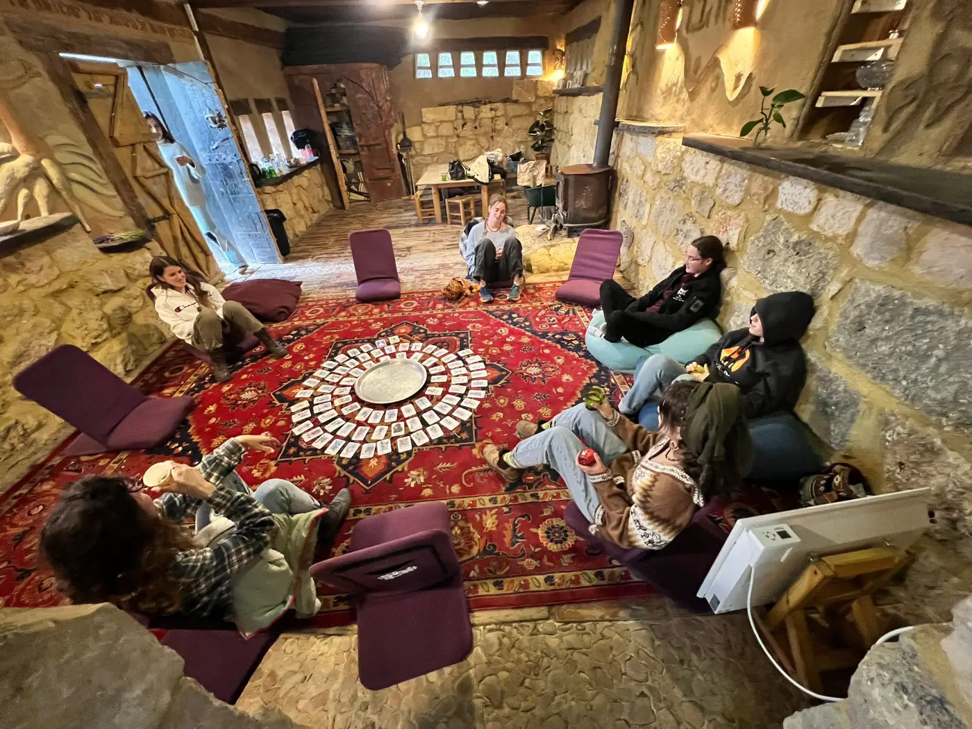 במקום תנור עצים, מחצלות, מזרונים, ופינת קפה.