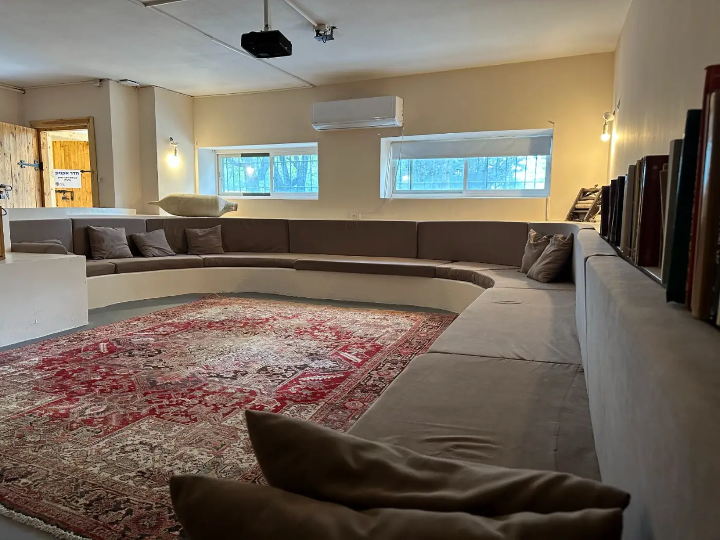 המרחב סגור וממוזג, מרוצף שטיחים, מוקף ספסלי ישיבה מרופדים ומצוייד במקרן, מסך ופינת קפה.